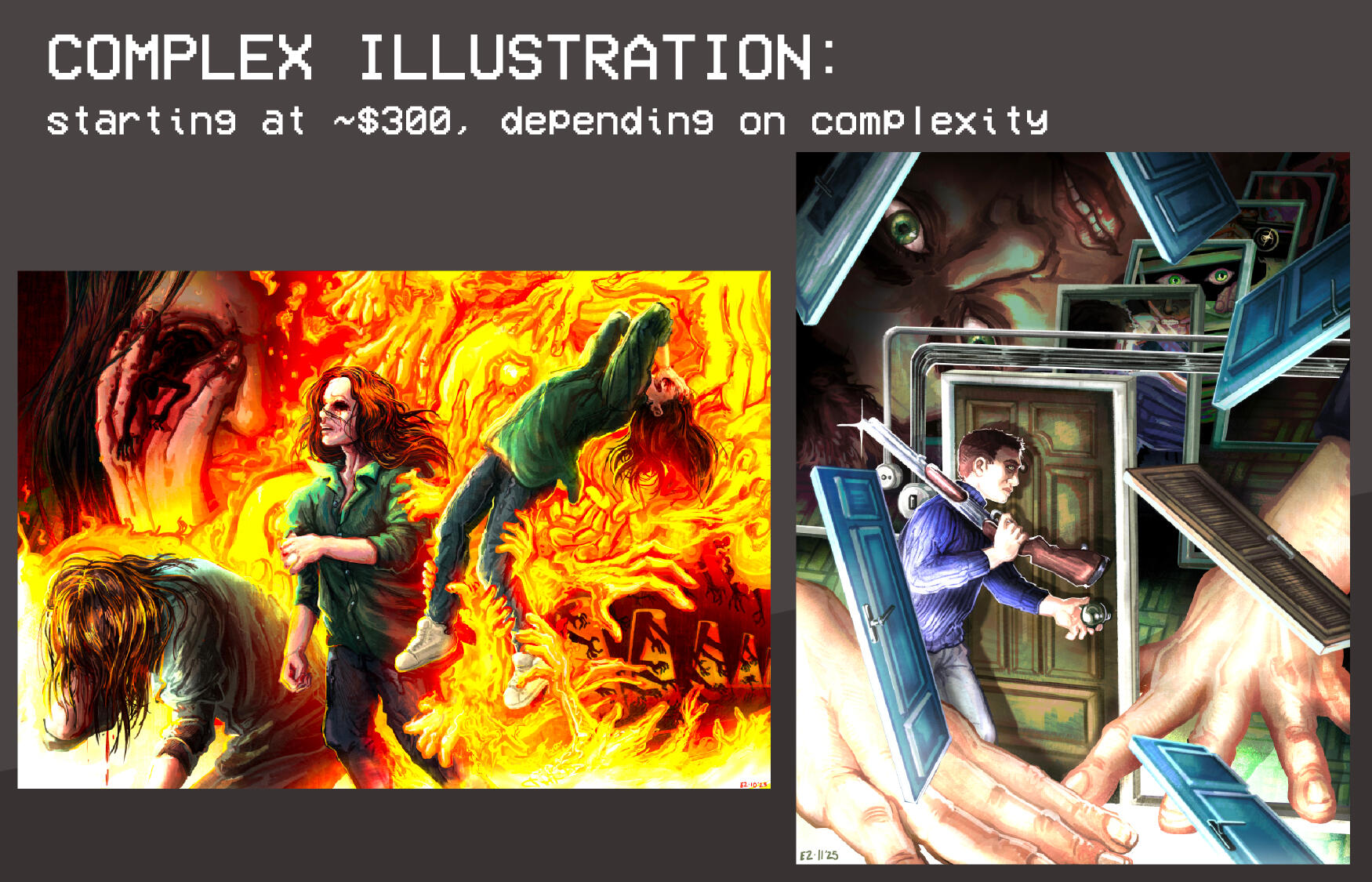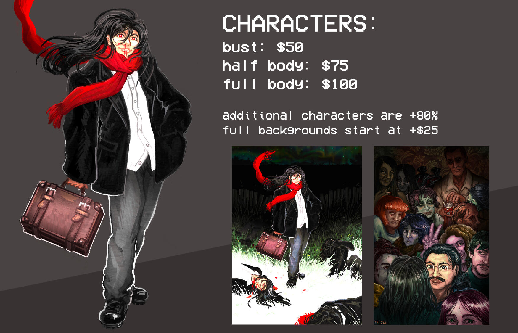 - These commissions are for personal use only -- please reach out to me about my commercial rates!- Commissions will be reimagined in my style- Price may change depending on complexity- Two major revisions are allowed at the cost of the commission -- any major revision past that will likely cost extra.- I prefer to use Paypal invoices, but I also take Venmo. All prices listed are in USD.- For commissions less than $200, payment is full upfront. For commissions $200 and above, you have the option to pay half upfront and half when the sketch is approved.- I only offer partial refunds if I have already started working on a commission. After a sketch is approved, I don't offer refunds. In the case I am unable to finish your commission, I will reach out and issue a full refund.- I have the right to refuse a commission for any reason- My artwork is not to be sold as NFTs or be used to train AI.- I aim to update weekly-biweekly. Commissions may take anywhere from 1 week - 1 month+ to complete. Time is based on current queue and life situations -- feel free to ask for an estimated timeline!- I reserve the right to add the commission in my portfolio. Commissions might also be posted on my online socials -- but please let me know if you don't want me to!- Visual references are required. Feel free to send any other references you think might help with the commission, such as moodboards or playlists -- the more info, the better! If you do not have visual references, there may be an added design fee.